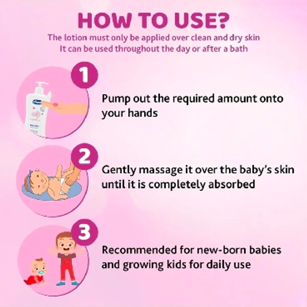 Apply to clean and dry skin throughout the day or after bath time massage gently until completely absorbed., Customer Care details Chicco -Mrs Monica Sachdeva (09871270832 ) Toll free 18001026702 Mail ID- monika.sachdeva@artsana.com & chiccoindia@artsana.com